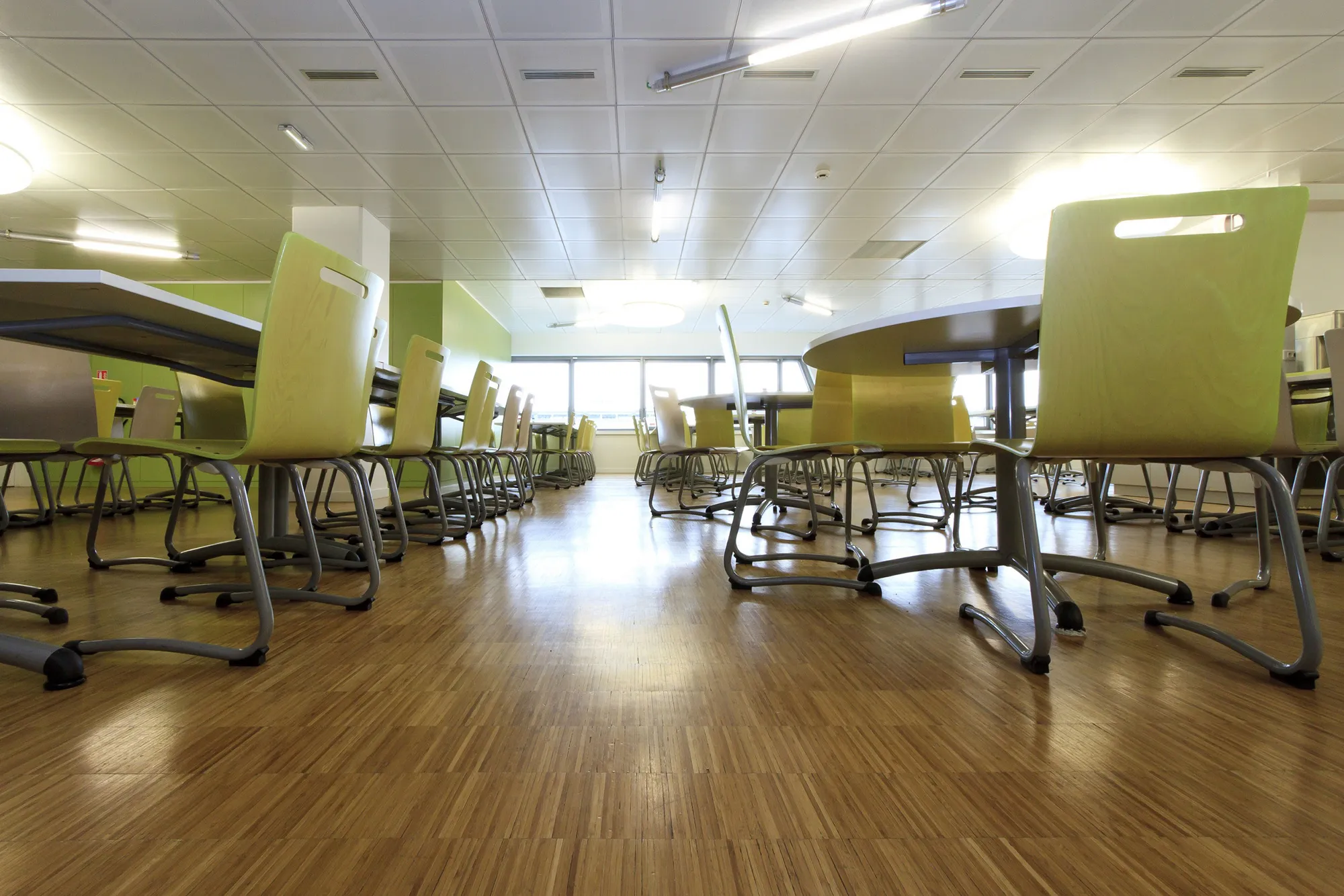 Salle du restaurant : parquet Bambou bois sur chant. Choix préconisé pour la dureté et la stabilité du bambou.